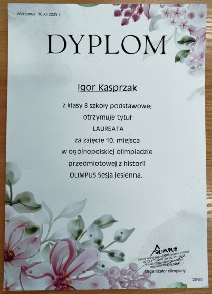 W sesji jesiennej 2025 OGÓLNOPOLSKIEJ OLIMPIADY Z HISTORII „OLIMPUS” Igor Kasprzak z klasy VIII uzyskując 212 punktów (88,33%) zdobył 10 miejsce i otrzymał tytuł laureata.